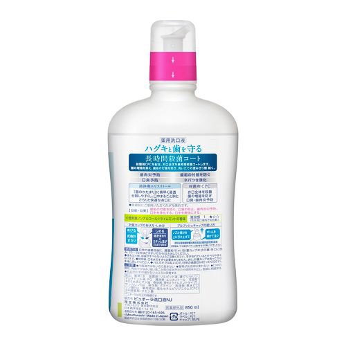 | 成分1 | 基剤:水 湿潤剤:ソルビット液 濃グリセリン マルチトール液 PG 清浄剤:エリスリトール 可溶剤:POE水添ヒマシ油 香味剤:香料 ライムミントタイプ サッカリンNa 保存剤:パラベン 洗浄剤:無水ピロリン酸Na 薬用成分:塩化セチルピリジニウム(CPC) pH調整剤:クエン酸 |
