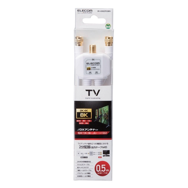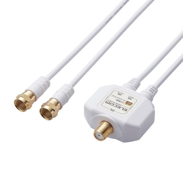 新4K・8K(3224MHz)放送に対応した製品です。地デジ・BS・CSのデジタル放送やケーブルテレビでも使用できます。テレビアンテナ線を2つの機器に分けます。テレビ、レコーダー、テレビチューナー付パソコンなどを増設する時に使用します。