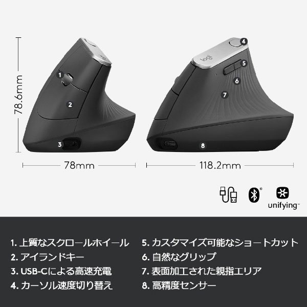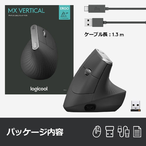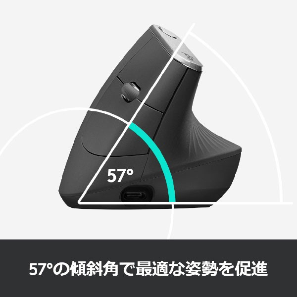 MX Verticalは、MXシリーズのパフォーマンスと人間工学を融合させた、高性能エルゴノミックマウス。ロジクールの調べによると、仕事でパソコンを使うユーザーは平均して1日約72分、距離に換算すると約30m、1年で約10kmマウスを動かしている。これに伴う筋肉の緊張を緩和するべく、MX Verticalが誕生。自然な握手位置と同じ傾斜をもたせることで、手首への圧力と前腕の緊張を低減。*1 独自の57°の角度は、エルゴノミクスの姿勢を保ちつつ、一切妥協のないパフォーマンスを実現。4000DPIの高精度センサーにより手の動きを1/4に軽減*2。カーソル速度切り替えスイッチにより、ワンタッチでDPI速度と精度を瞬時に調節可能。MX Verticalは、フル充電で最長4ヶ月、1分間の充電で3時間使用可能な高速充電に対応。*3