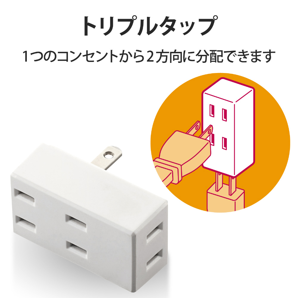 耐熱性に優れたユリア樹脂を使用。1つのコンセントから3口に電源を分配することができるトリプルタップ。