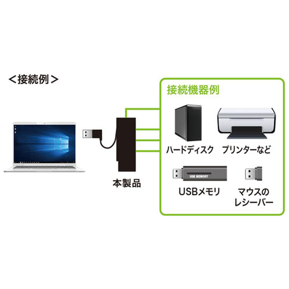 | 仕様1 | 電源:バスパワー 供給電流:最大400mA(全ポート合計) ※接続する機器の消費電流が本製品の供給電流を超える場合、バスパワーで正常に動作しない場合があります。 |