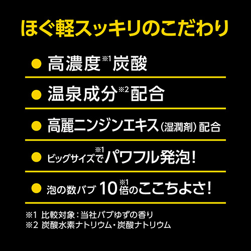 | 成分 | [有効成分]炭酸水素ナトリウム、炭酸ナトリウム、[その他の成分]フマル酸、PEG6000、還元水アメ末、ミリスチン酸イソプロピル、テトラオレイン酸POEソルビット、人参エキス、メントール、トレハロース、酸化マグネシウム、デキストリン、ブドウ糖、グリシン、ミリスチン酸オクチルドデシル、POEステアリルエーテル、POE水添ヒマシ油、 |