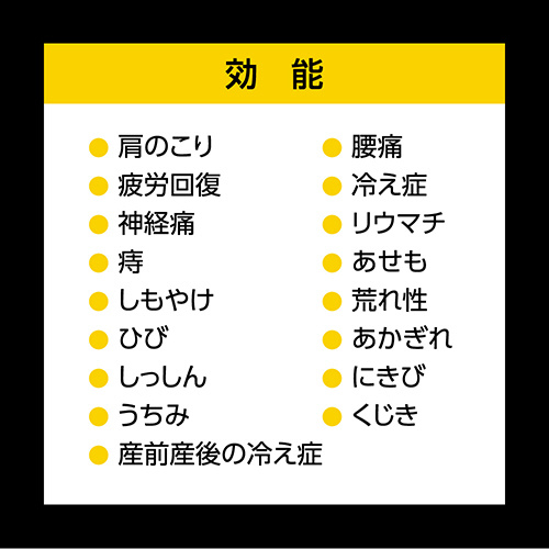 | 効果効能 | 肩のこり、腰痛、疲労回復、冷え症、神経痛、リウマチ、痔、あせも、しもやけ、荒れ性、ひび、あかぎれ、しっしん、にきび、うちみ、くじき、産前産後の冷え症 |