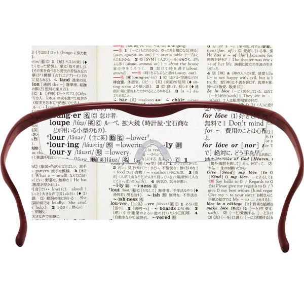 メガネ・コンタクトの上から掛けられ、両手が使えるメガネ型拡大鏡。ブルーライト35%カットのクリアレンズ。衝撃に強く、小さく軽い、持ち運びに便利な標準サイズ。