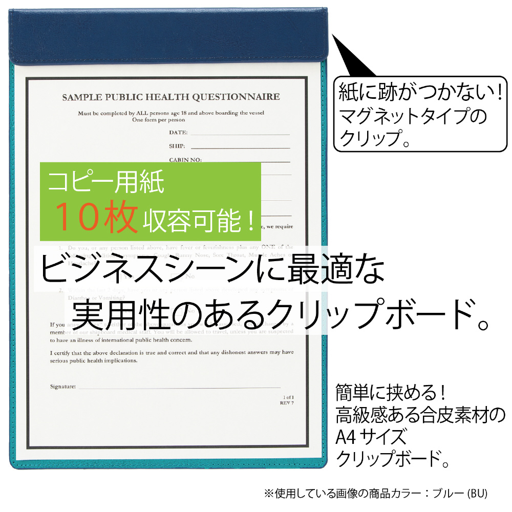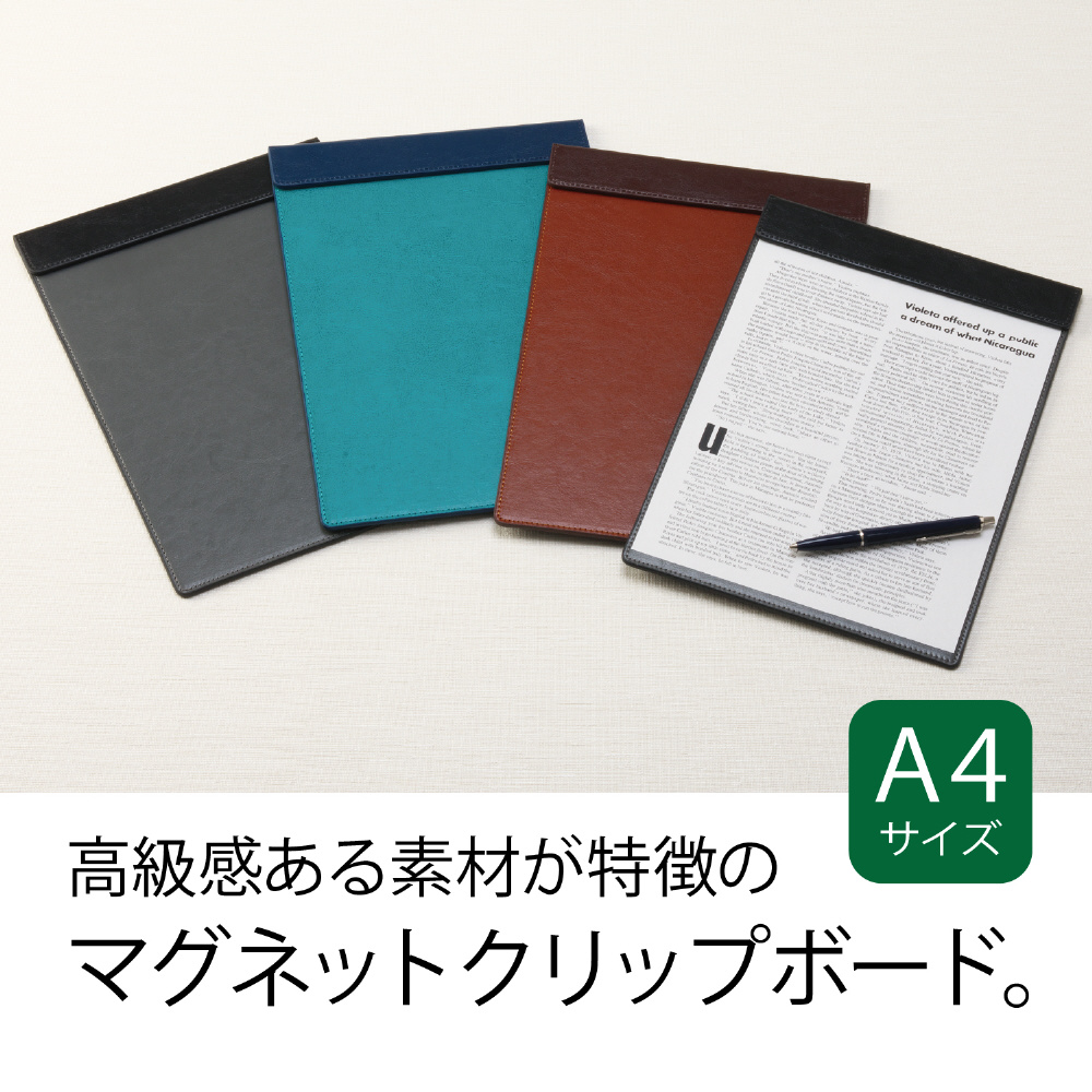 高級感のある合皮製のクリップボード。クリップがマグネットタイプなので簡単に書類を挟めます。