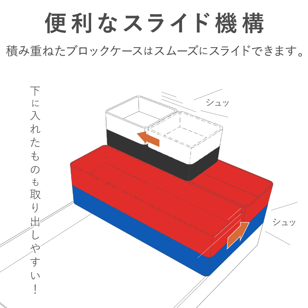 ■便利なスライド機構積み重ねたブロックケースは、スムーズなスライドができるので、自由に使いやすい位置取りができます