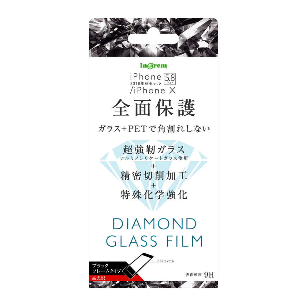 iPhone XS 5.8インチモデル ダイヤモンド ガラスフィルム 3D 9H アルミノシリケート 全面保護 光沢 ソフトフレーム ブラック IN-P20FSG/DCB