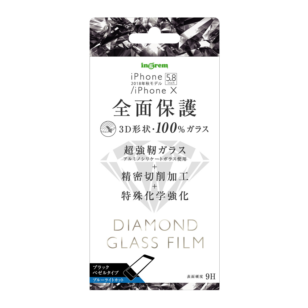 iPhone XS 5.8インチモデル ダイヤモンド ガラスフィルム 3D 9H アルミノシリケート 全面保護 ブルーライトカット /ブラック IN-P20RFG/DMB