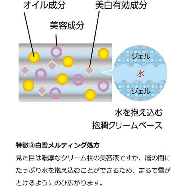 まるで雪がとけるるようにみずみずしく広がり、うるおいが角層深くまで浸透。 透明感あふれる白雪のような肌へ導く、美白美容液。 資生堂初のテクノロジー「ナチュエンス処方」*採用。 *日本古来の天然由来美容成分の力を、資生堂が長年培ったスキンケアサイエンスの技術で引き出した資生堂独自の処方。