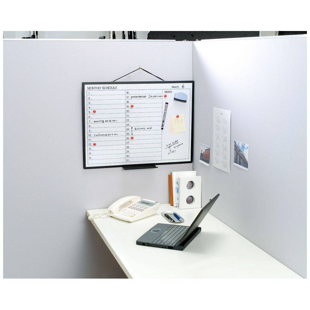 | 仕様1 | サイズ:A2 本体サイズ:W600 x H450 x D13mm(受け皿取付時:D63mm) 本体重量:1300g(包装資材含む/1コ箱含まず) 素材:フレーム=PP、裏面=圧縮ボード、ボード面=スチール 付属品: ボードマーカー(中綿式/黒インク)1本 マグネット付イレーザー 1コ 受け皿(幅18cm) 1コ 休日表示マグネット(直径15mm)6コ |