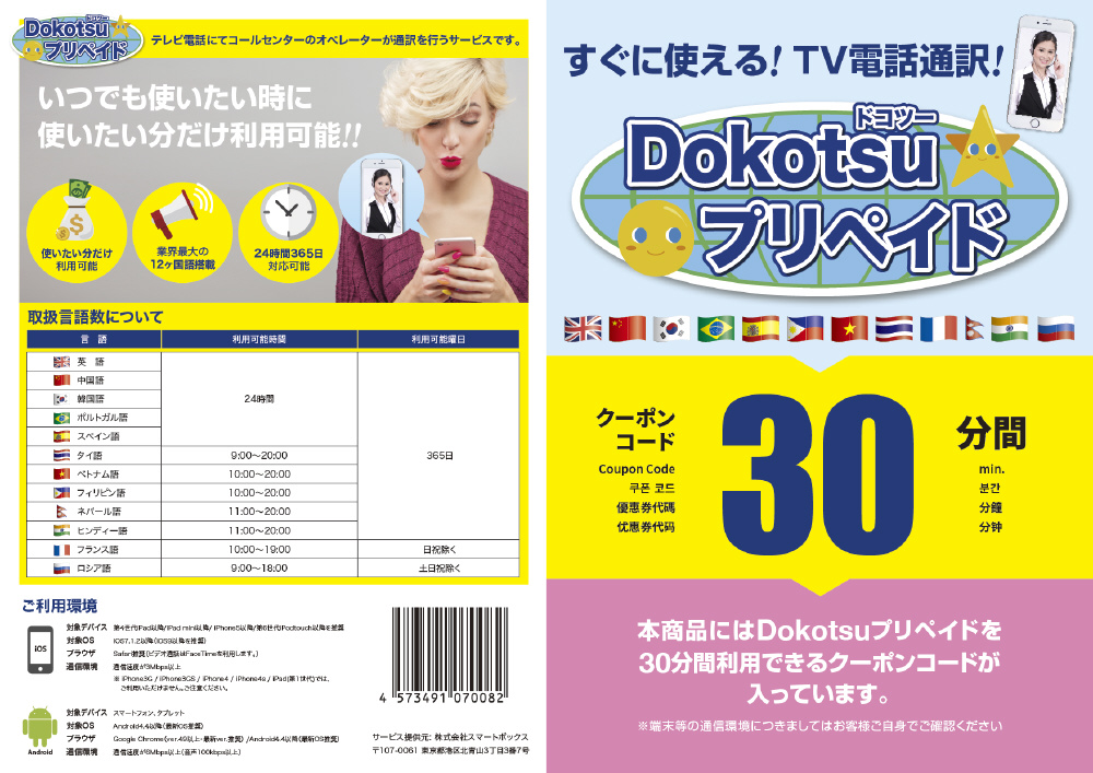 設定方法は、専用カードご購入後に記載のクーポンコードをご自身のスマホやタブレットに入力するだけで、いつでもどこでもリアルタイムに「通訳サービス」がご利用可能となっております。 「対応言語は 12 ヶ国語」 英語・中国語・韓国語・ポルトガル語・スペイン語・フィリピン語・ベトナム語・タイ語・ フランス語・ネパール語・ヒンディー語・ロシア語」 海外旅行・海外出張など外国人の方たちとのコミュニケーションにお役立て下さい!