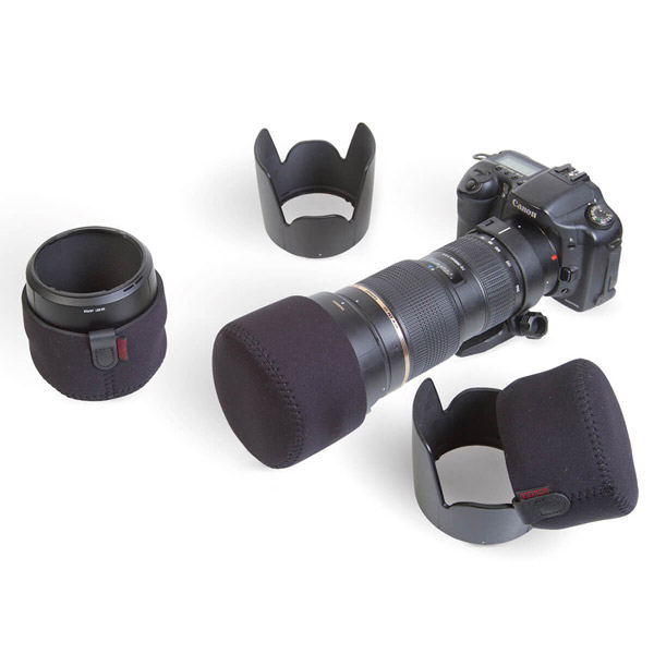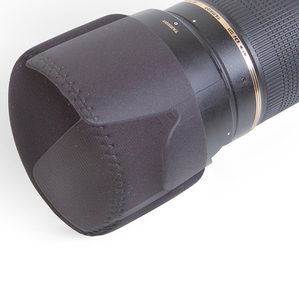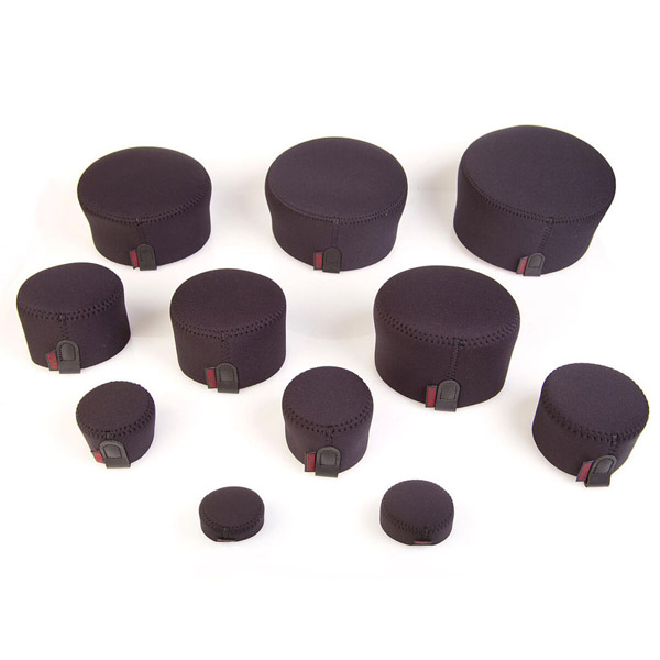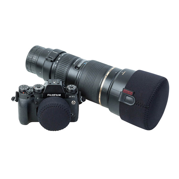 筒状のデザインで、レンズやレンズフードにしっかりとフィットします。また、素材はオプテックの特徴であるネオプレンで、耐久性に優れながら伸縮性があり、着脱をスムーズに行うことができます。