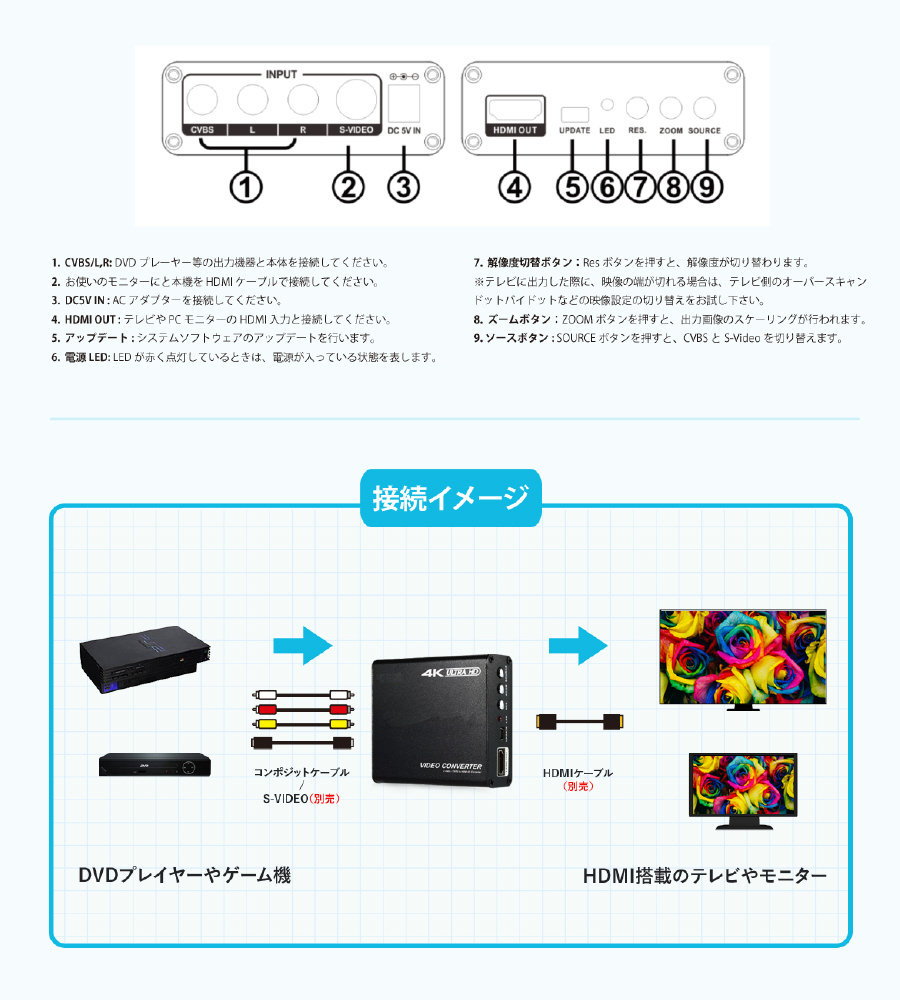 4K出力対応 S端子/コンポジット出力変換アップスキャンコンバータ
