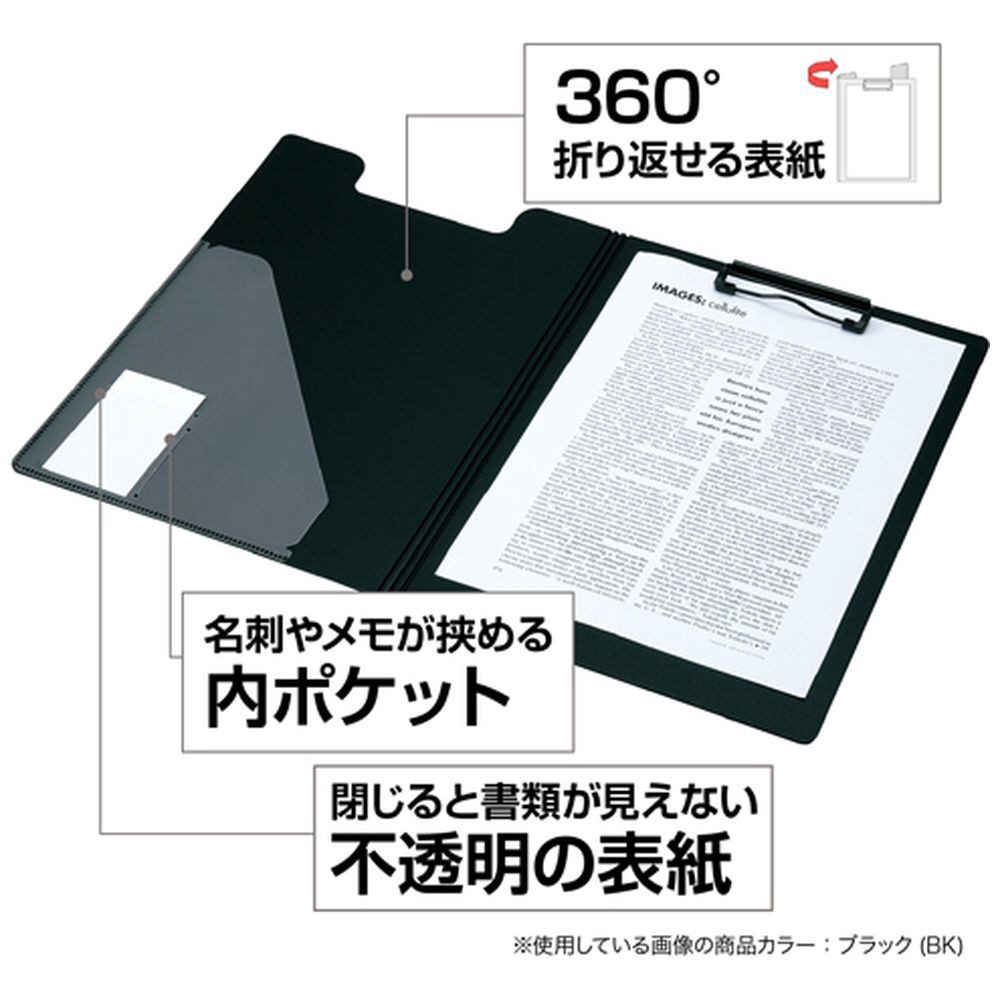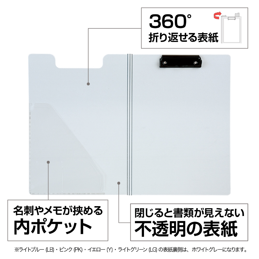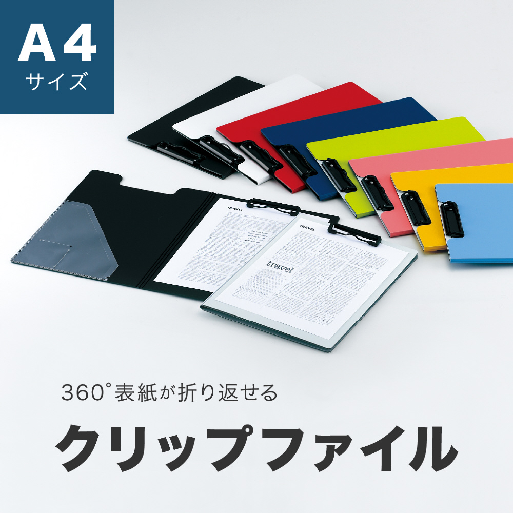 軽くて丈夫、環境に優しいクリップファイル。表紙が360度折り返せます。