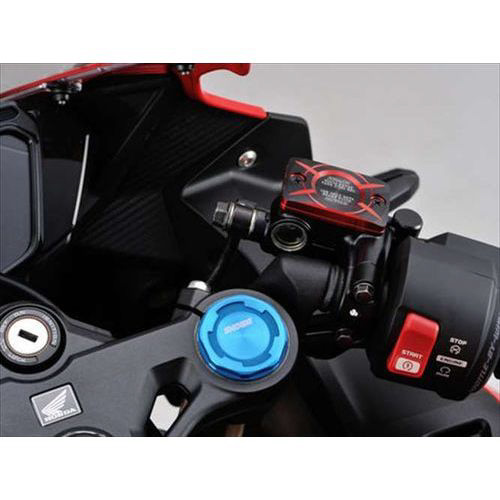 ●純正マスターシリンダーのタンクキャップを、アルミ無垢材を繊細かつ丁寧な加工で削り出し、コントラスト際立つデュアルアルマイトで仕上げました。