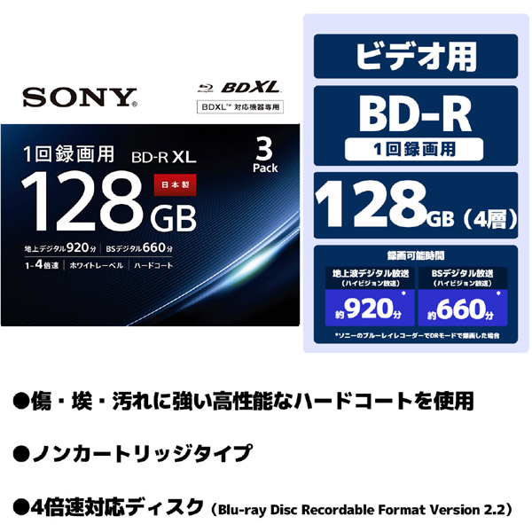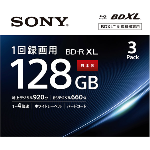 大容量「BDXL」対応。インクジェット対応ワイド(BD-R 4層:4倍速)ブルーレイディスク 3枚