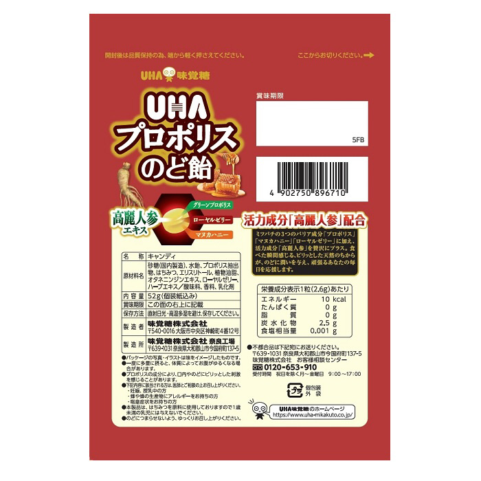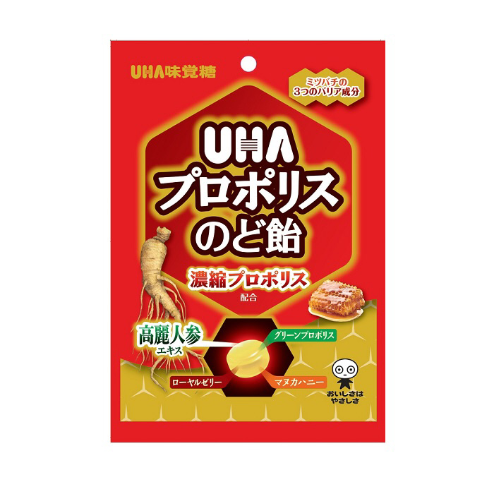 食べた瞬間ピリッとした効果感を感じられる一方、お菓子メーカーである味覚糖の知見を活かし、プロポリスのクセを感じない、美味しく食べやすいのど飴です。ミツバチの3つのバリア成分と高麗人参エキスを配合し、健康の基礎づくりをサポートする商品です。