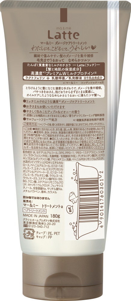 | 商品名 | ma&me(マー&ミー)Latte(ラッテ)ダメージケアトリートメント(180g)[トリートメント] |