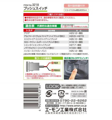 | 商品名 | 3218 プッシュスイッチ(トヨタ車用) ON-OFF DC12V・500mA |