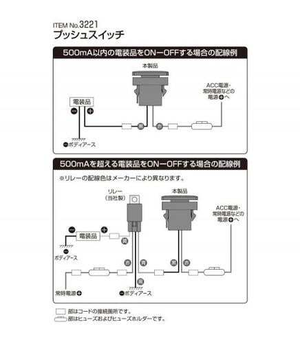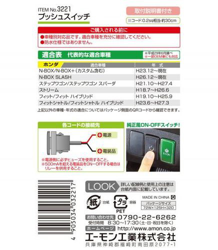 | 商品名 | 3221 プッシュスイッチ(ホンダ車用) ON-OFF DC12V・500mA |