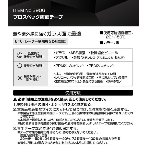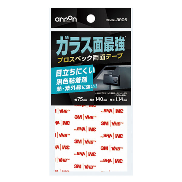 3906 超強力両面テープ (柔らかいダッシュボードなどに) ポリエチレン・塩ビ対応 車内用 黒色 幅75mm×長さ140mm×厚さ1.14mm