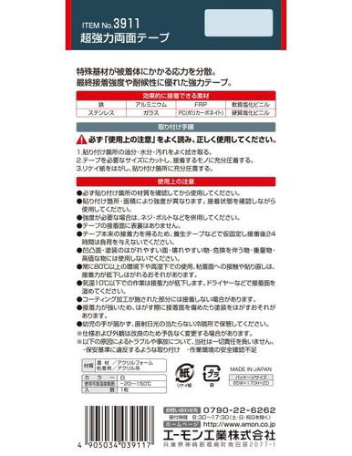 | 商品名 | 3911 超強力両面テープ (バンパー・スポイラーなどに) 車外用 強力固定タイプ 白色 幅75mm×長さ140mm×厚さ1.14mm |