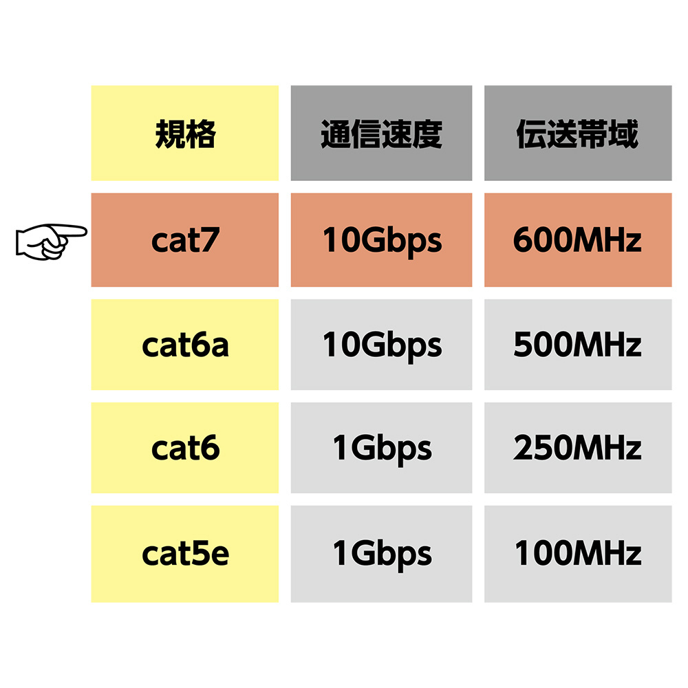 CAT.5eの6倍、CAT.6の2.4倍である600MHzの伝送帯域に対応!この帯域が広いほど高速でのデータ転送が可能になり、データエラーを防止します。