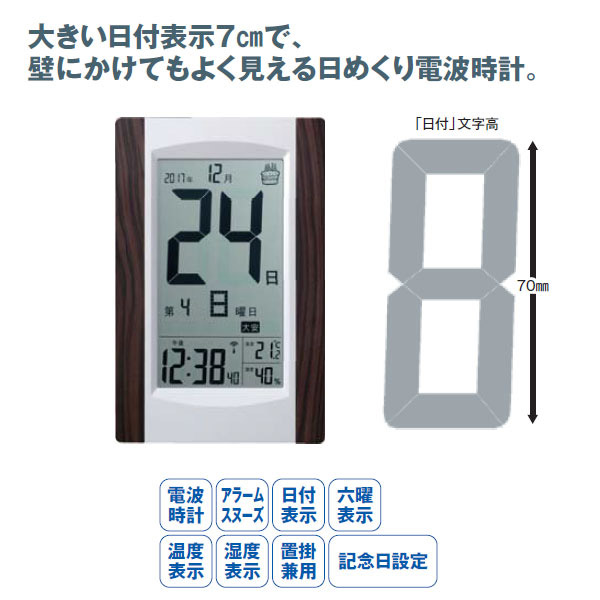 大きい日付け表示(7cm)で壁にかけても表示がよく見えるデジタル表示の日めくり電波時計。