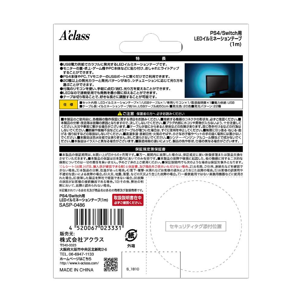 | 商品名 | 【在庫限り】 PS4/Switch用 LEDイルミネーションテープ1m [SASP-0486] |