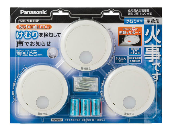 | 商品名 | 「けむり当番薄型2種」 (電池式・移報接点なし・あかり付)(警報音・音声警報機能付) SHK7030139P 【864】 |