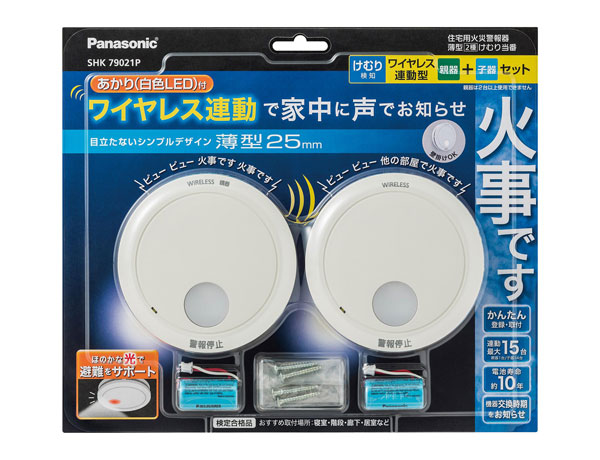 「けむり当番薄型2種 」 (電池式・ワイヤレス連動親器・子器セット(2台)・あかり付)(警報音・音声警報機能付) SHK79021P