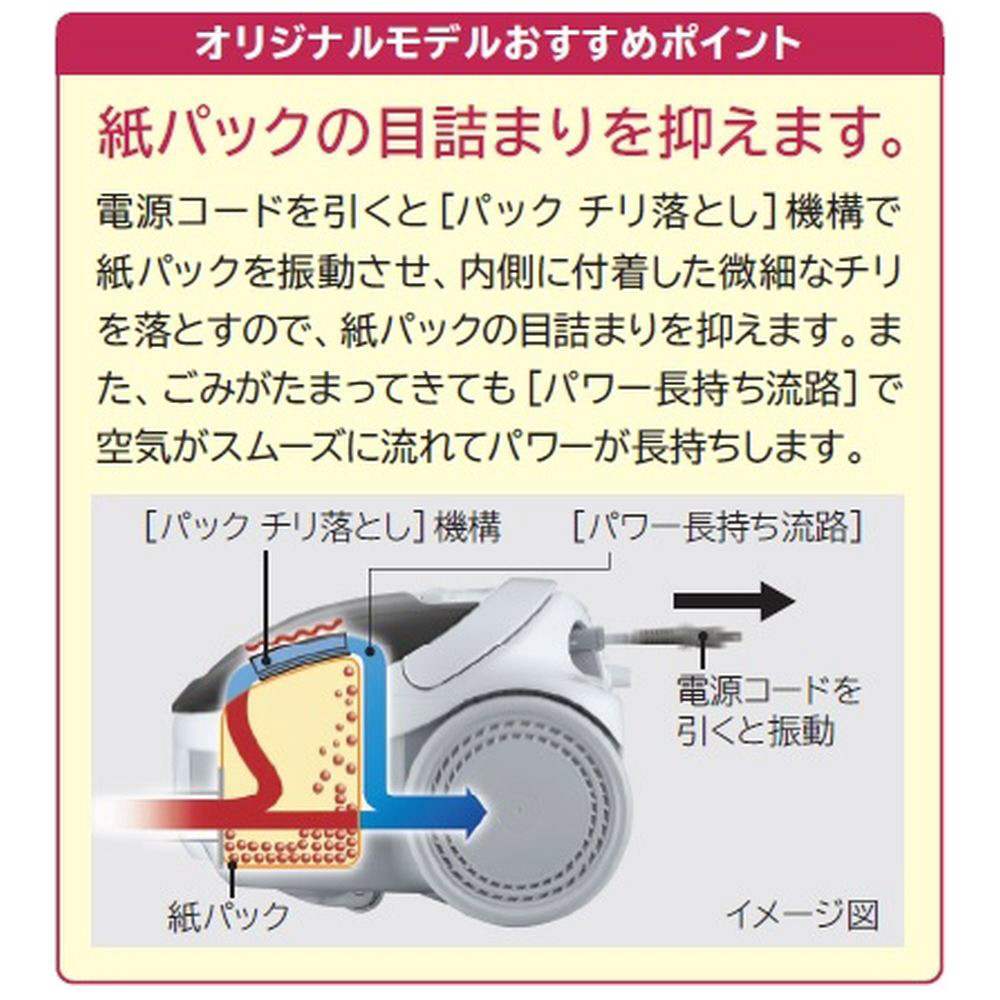 電源コードを引くと[パック チリ落とし機構]で紙パックを振動させて内側に付着した微細なチリを落とします。