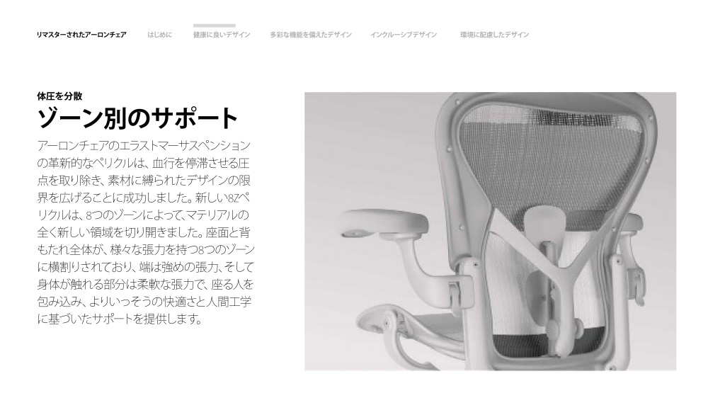 座面と背もたれにそれぞれ異なる張力を持つ8つのゾーンに横割りし、よりいっそうの快適さを人間工学的にサポートします。