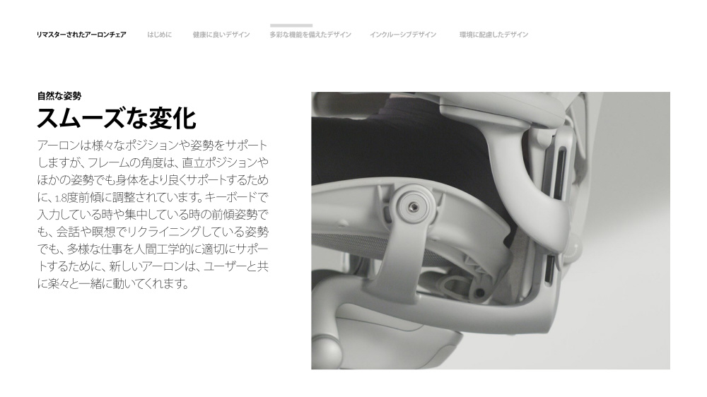 スリムで最新のチルトメカニズムにより、チェアが身体に合わせて自然に動くため、直立した姿勢からリクライニングした姿勢まて゜、背もたれが身体をサポートしている状態を保ちながら、スムーズかつ簡単にシフトできます。