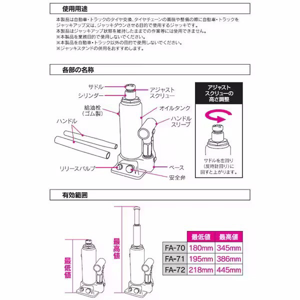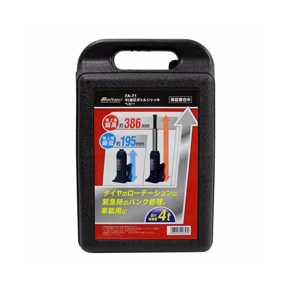 FA-71 メルテック 車用 油圧ボトルジャッキ 4t ヘビー 最高値/最低値 386/195mm 収納ブローケース付き