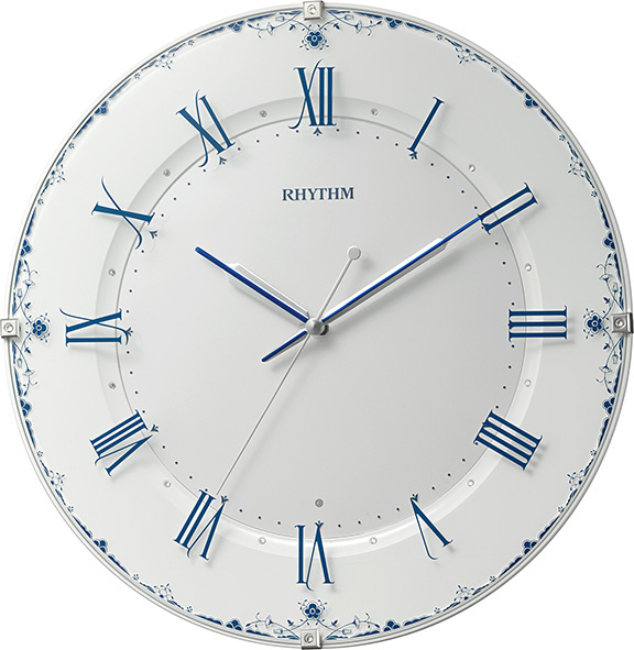 白磁に青い模様が入ったヨーロッパの食器のような上品なデザインの電波掛け時計
