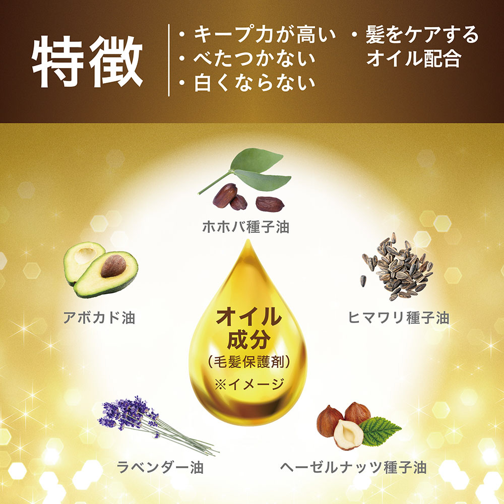 ヘアスタイルをしっかり固めてロングキープ。雨・風の日もくずれません。髪をケアする5種類のVital Oilを配合。無香料。