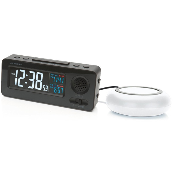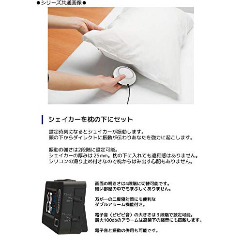 普通のアラームでは起きられないひとにぴったり。強力な振動で寝起きの悪いあなたを起こします。耳の不自由な方や隣で寝ている人を起こさずに起きたい方、普通のアラームでは起きられない方に便利なデジタル電波時計。
