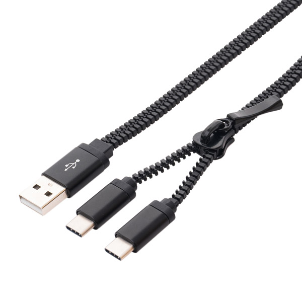 USB Type-C対応機器を2台同時に充電できる、ファスナー式充電専用ケーブル