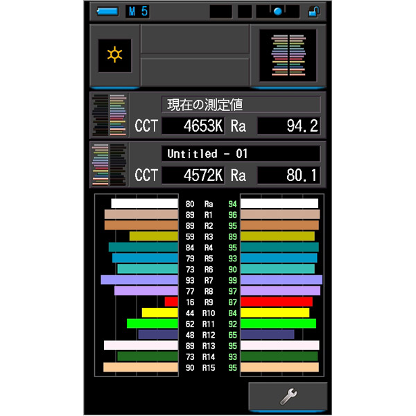 CIE1931x,y の色度座標と、Hue(色相)、Saturation(彩度)のテキスト表示を追加。表示可能項目は、前記の他、色温度、LB 指数、LB カメラフィルター、LB ライトフィルター、CC 指数、CC ナンバー、CC カメラフィルター、CC ライトフィルター、照度、TM30-15(Rf、Rg)、SSI(標準光源比較、メモリ光源比較)、TLCI、CRI(Ra、R1〜R15)などの中から5項目を選択。