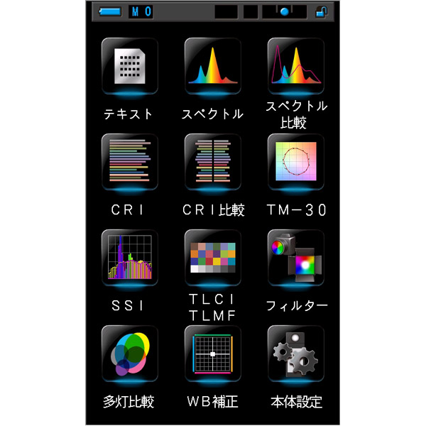 CRI (Color Rendering Index)、SSI (Spectral Similarity Index)、TLCI (Television Lighting Consistency Index)、TLMF (Television Lighting Matching Factor)、TM-30-15 (Technical Memorandum) の評価モードを搭載。