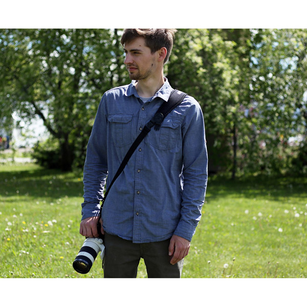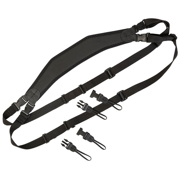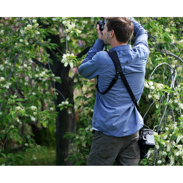ユーティリティスリングデュオは、2 つのカメラを安全に、そして快適に持ち運べるスリングストラップです。