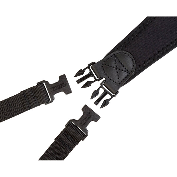 ユニループが2 組付属しています。パッド部分には衝撃を吸収するストレッチ素材とネオプレンを使用し、肩への負担を軽減しています。また、パッド裏側の滑り止めにより肩にしっかり固定できるので、快適な着け心地で重いカメラを運ぶことができます。