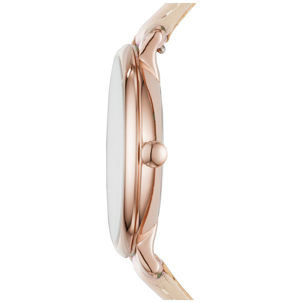 ローマ数字のインデックスがクラシックな印象。肌馴染みの良い、ピンクベージュのストラップに、秒針のネイビーがアクセント。