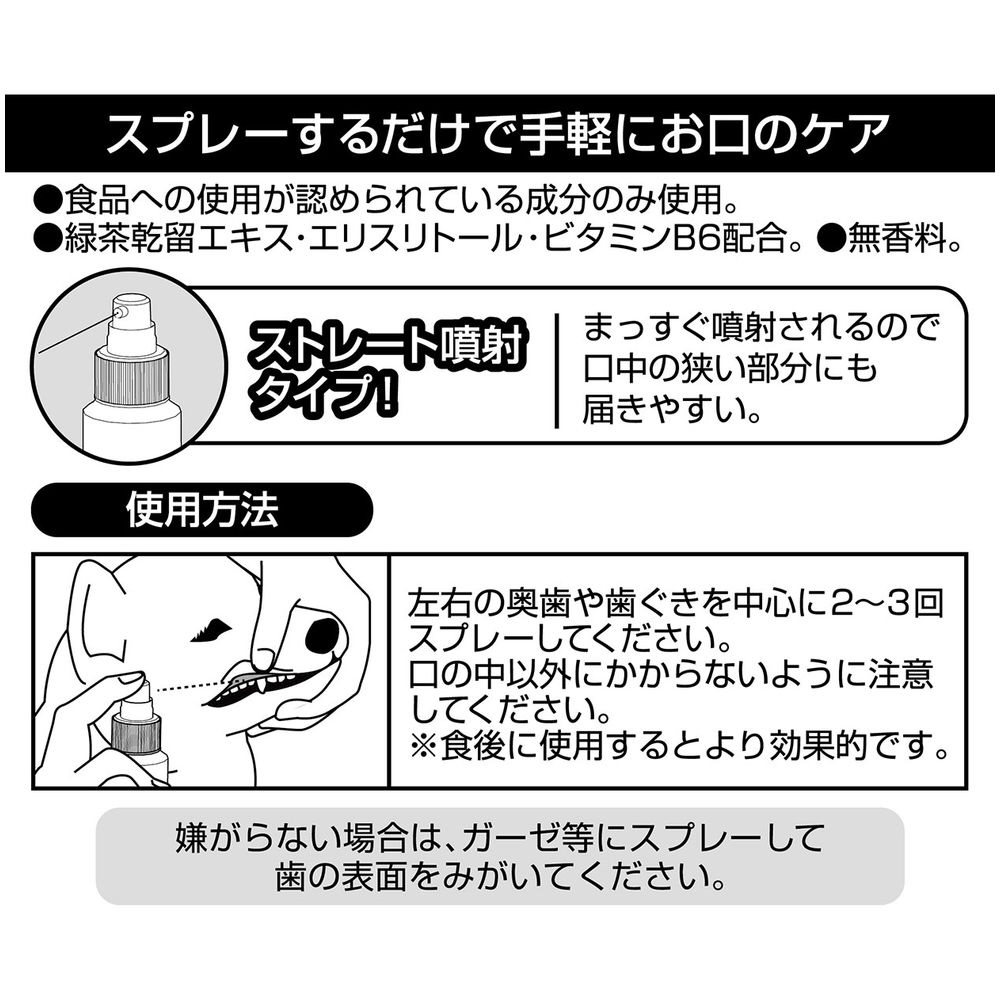 スプレーするだけで口の中に有効成分が広がり簡単にデンタルケアができます。ストレート状に噴射されるタイプなので噴射口が口中に直接触れず衛生的で、小型犬等の狭い口中にも使用できます。人用にも使用されている成分を配合しています。