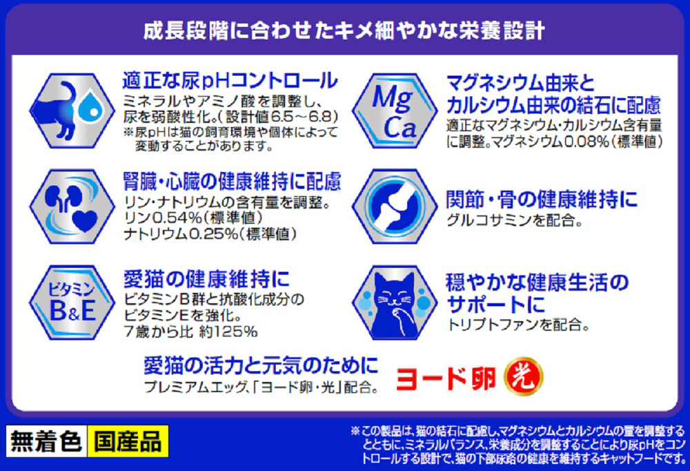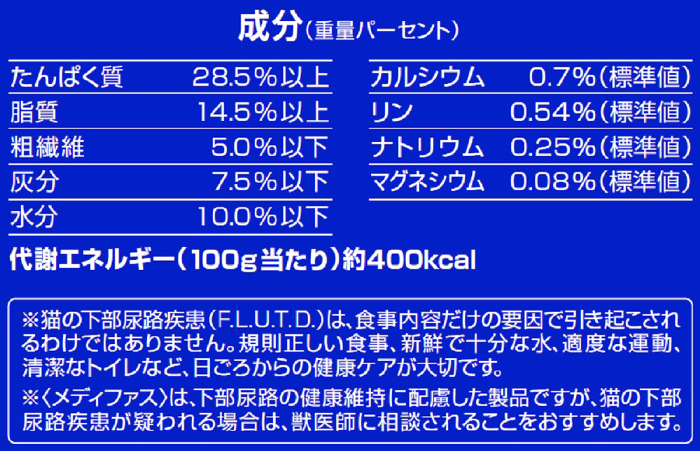 | 仕様1 | たんぱく質28.5%以上、脂質14.5%以上、粗繊維5.0%以下、粗灰分7.5%以下、水分10.0%以下、カルシウム0.7%(標準値)、リン0.54%(標準値)、ナトリウム0.25%(標準値)、マグネシウム0.08%(標準値)、代謝エネルギー(100gあたり)約400kcal、尿pH設計値6.5〜6.8 |
