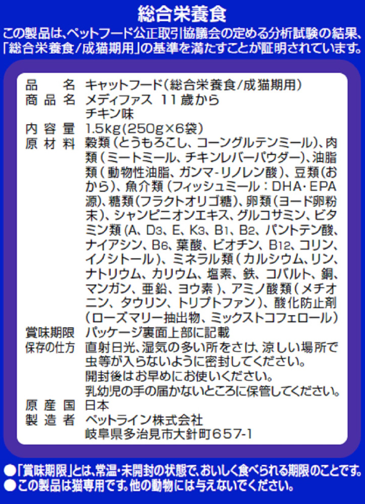 | 商品名 | メディファス 11歳から チキン味 1.5kg(250g×6) |