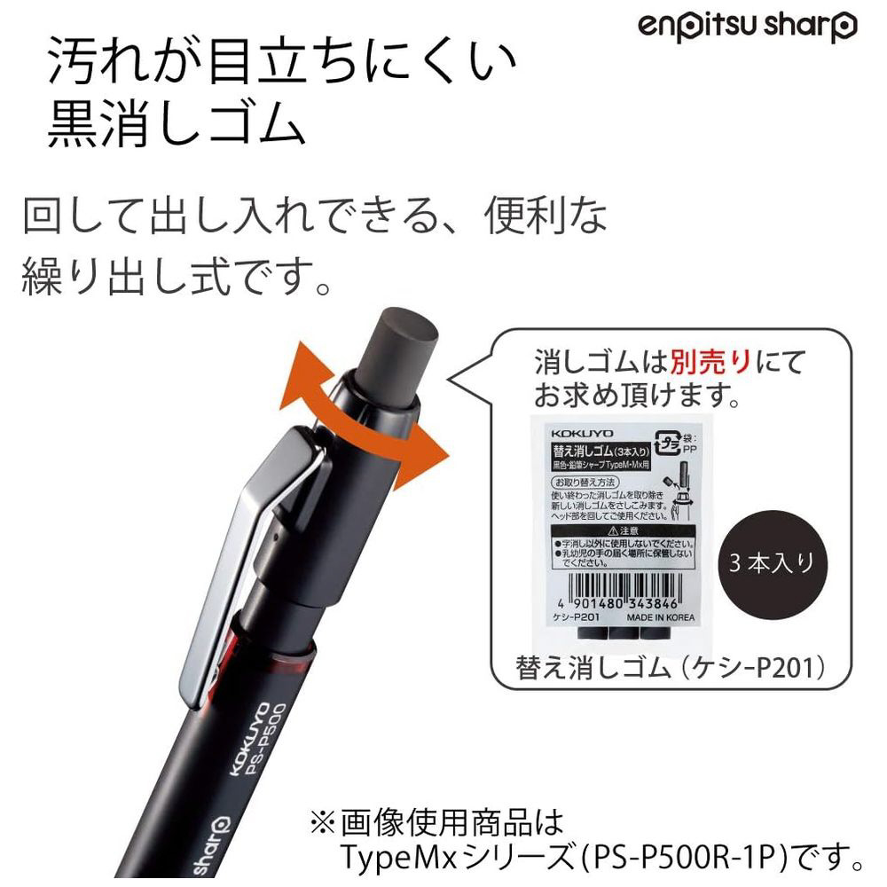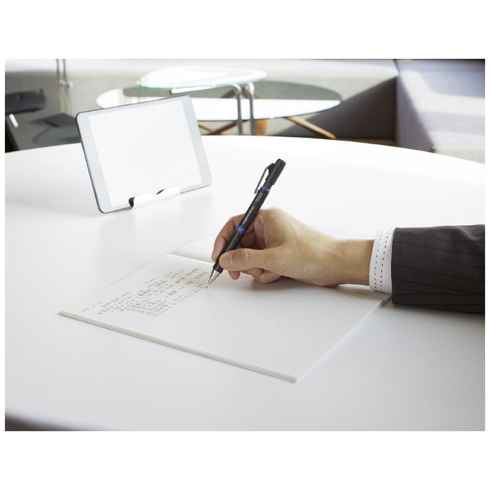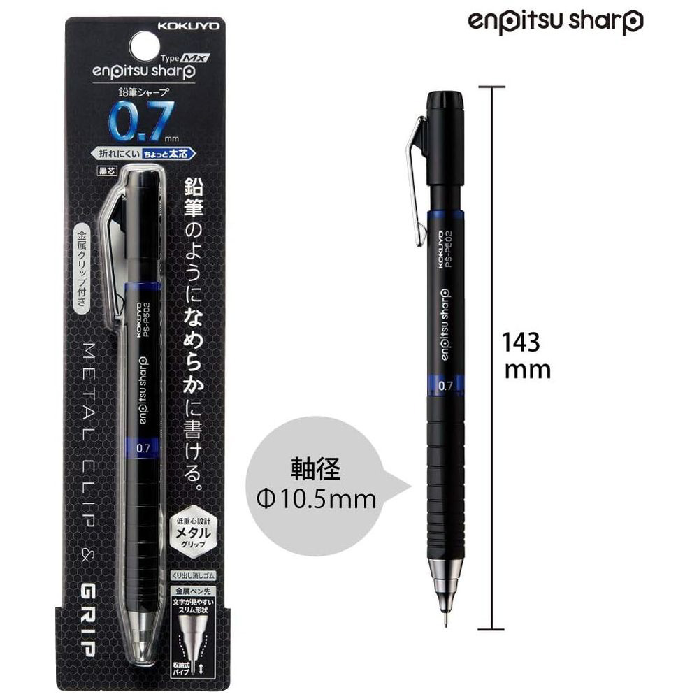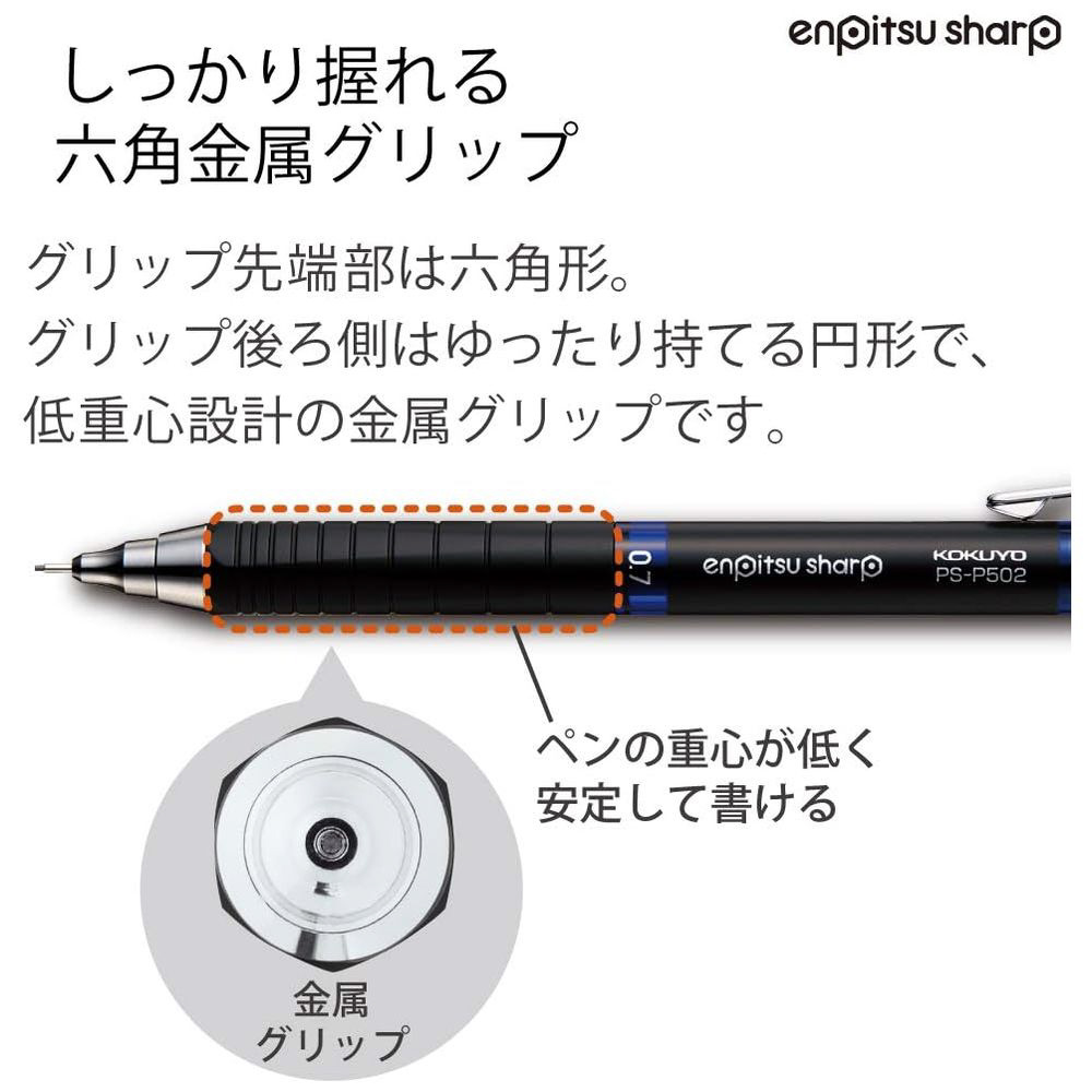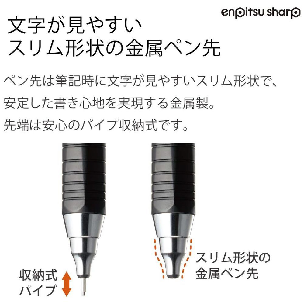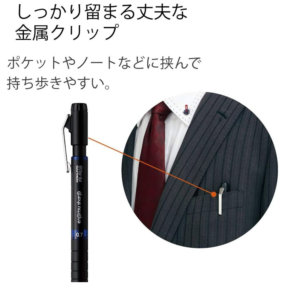 鉛筆のようになめらかに書ける。金属クリップと黒消しゴムの付いた大人の太芯シャープペンシルです。
