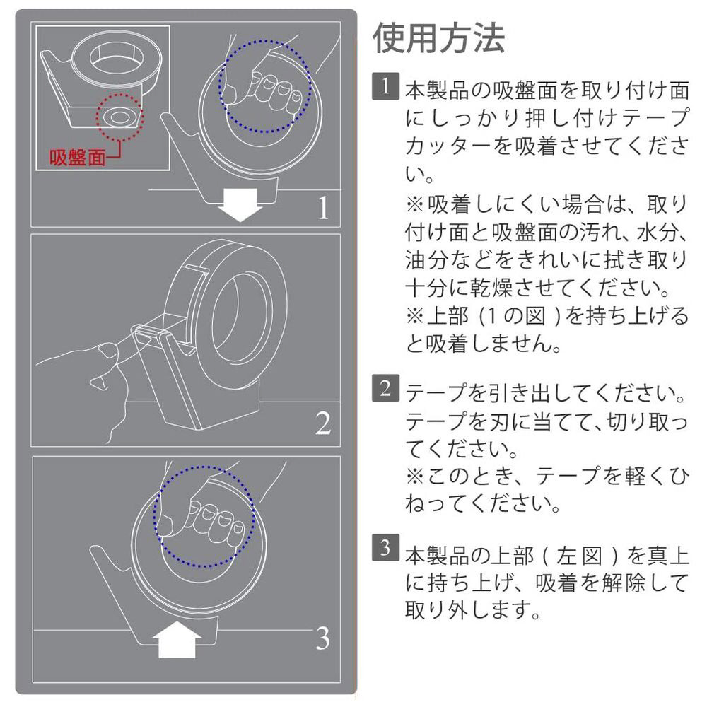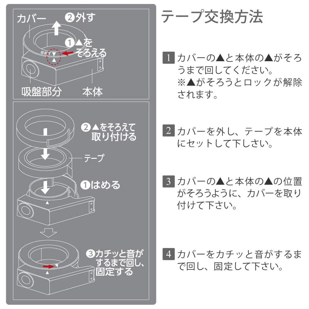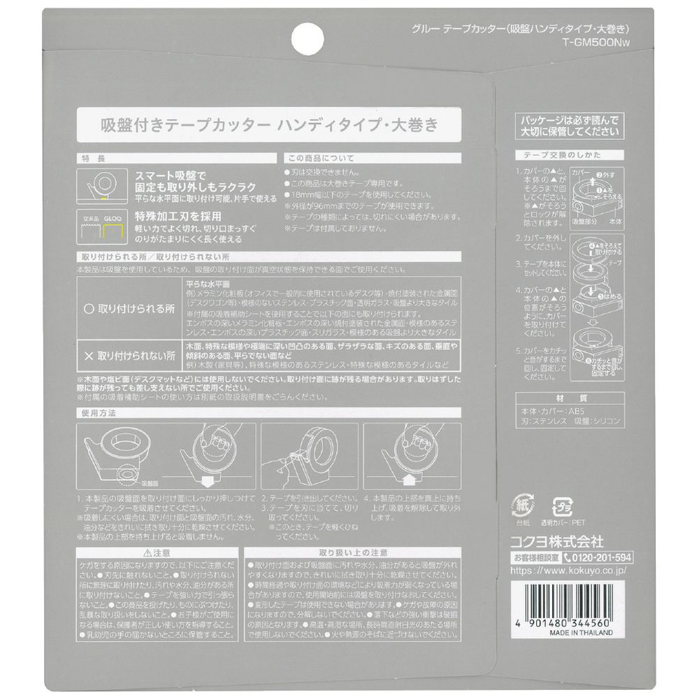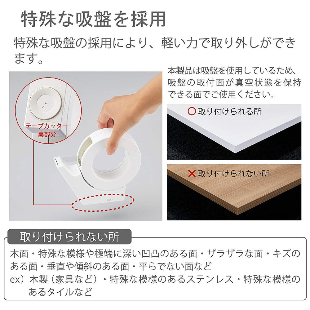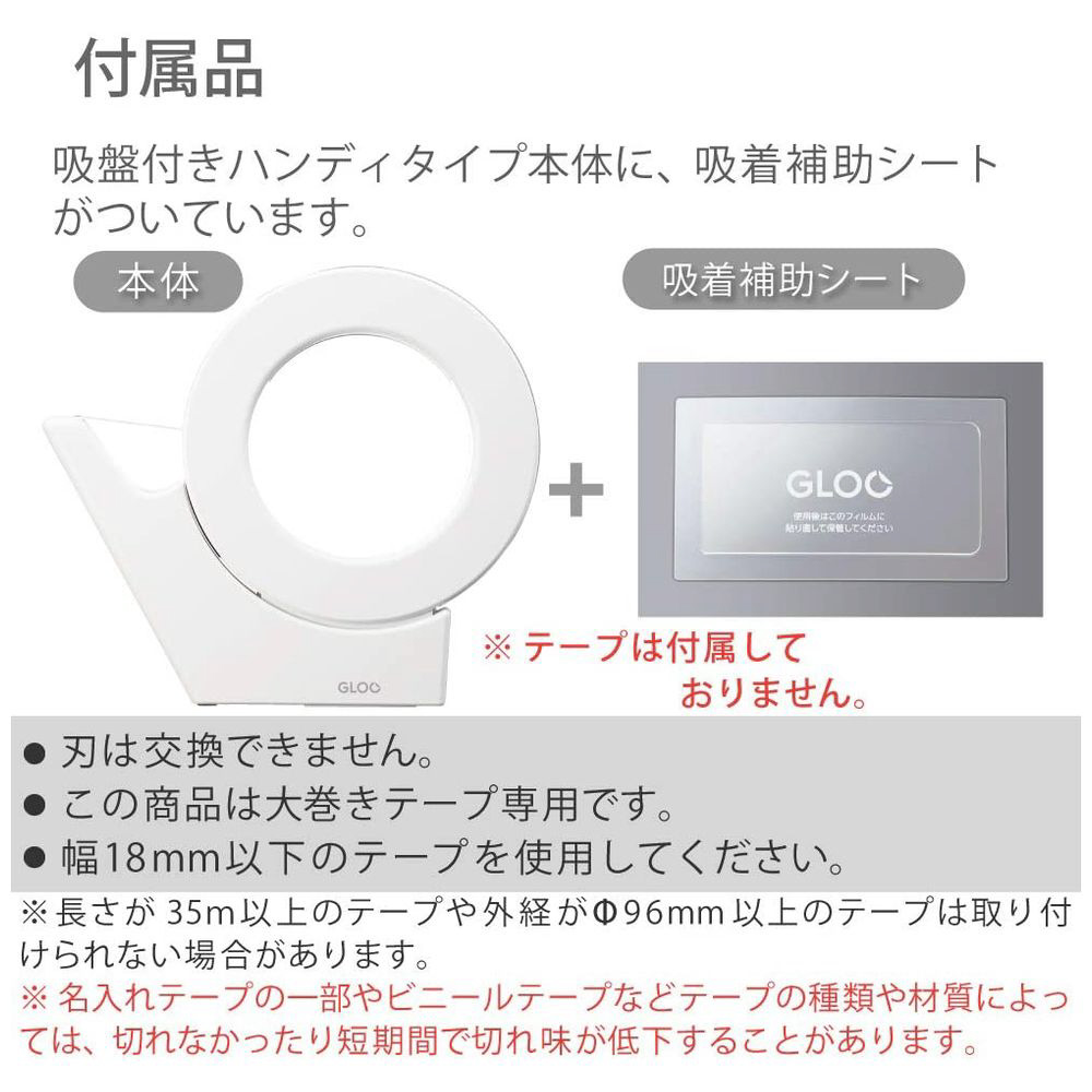 | 仕様1 | ●材質/本体・カバー: R-ABS、刃: ステンレス、吸盤: シリコン、付属吸着補助シート/シート: ウレタン・PET、フィルム: PET●質量/126g●幅18mm・外径96mmまでの大巻きテープが使用できます。◆製品色/W…白 再生材配合率/本体: R-ABS 100% |