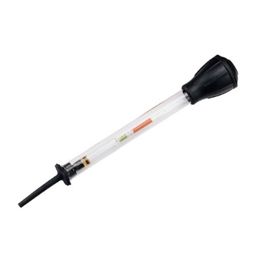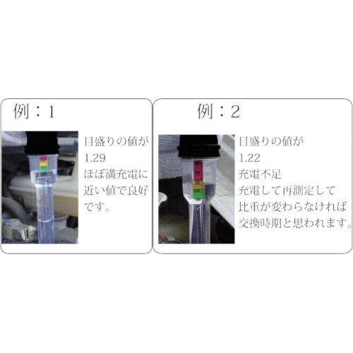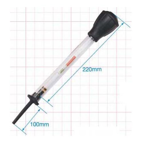 ●スポイト構造で、中にバッテリー液を吸い込み、内蔵されている測定子(浮き)がどの部分まで液に沈むか測定